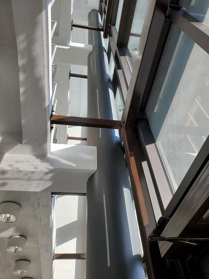 Work included the construction of a new north and south curtain wall, new interior floor and wall finishes, and installation of sun shades. The installation of the sun shades will help cut down on energy costs.